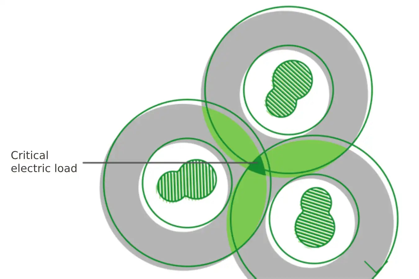 The electric charges from individual spheres overlap, creating a high-intensity electric field inside the pore.